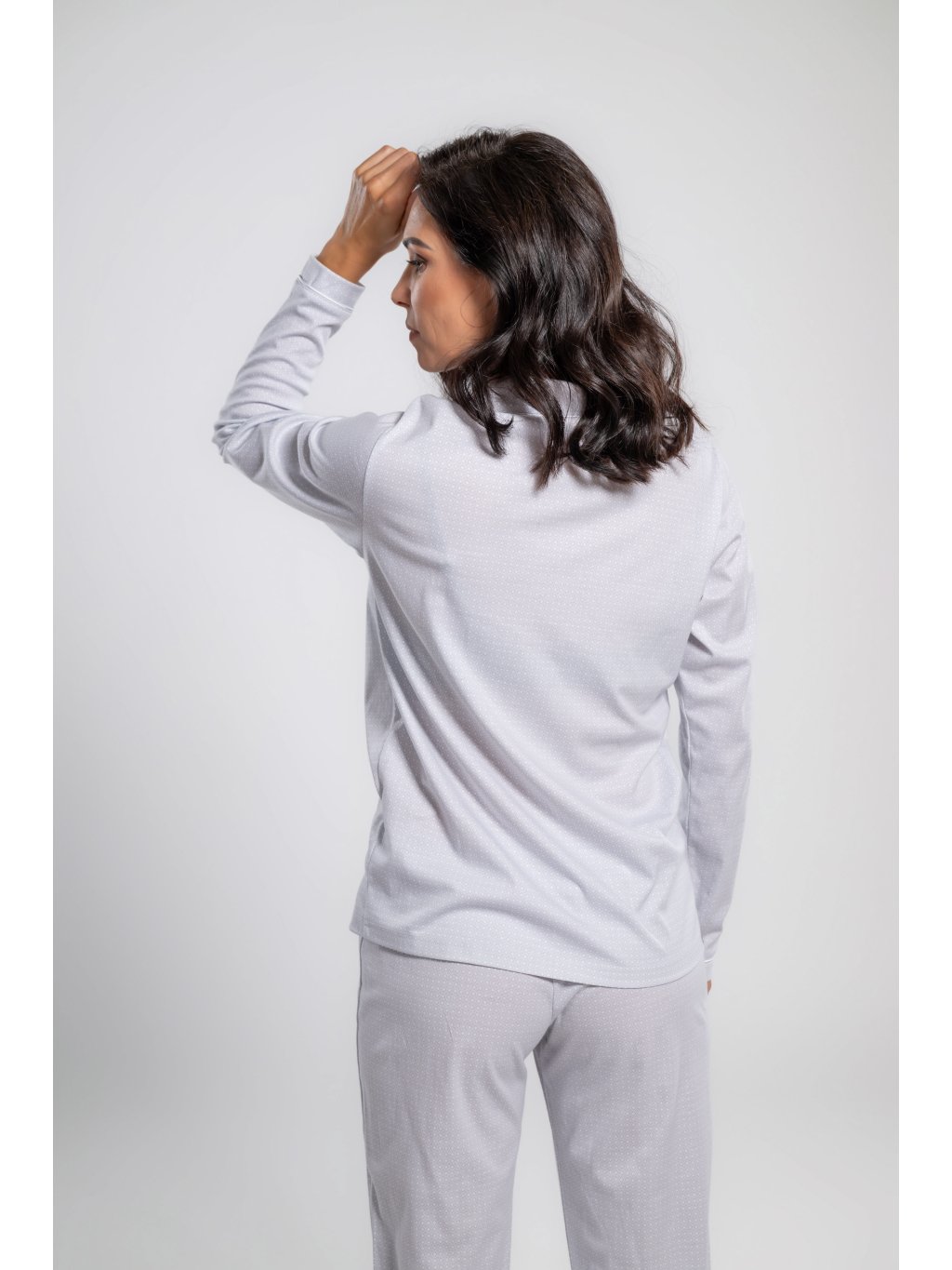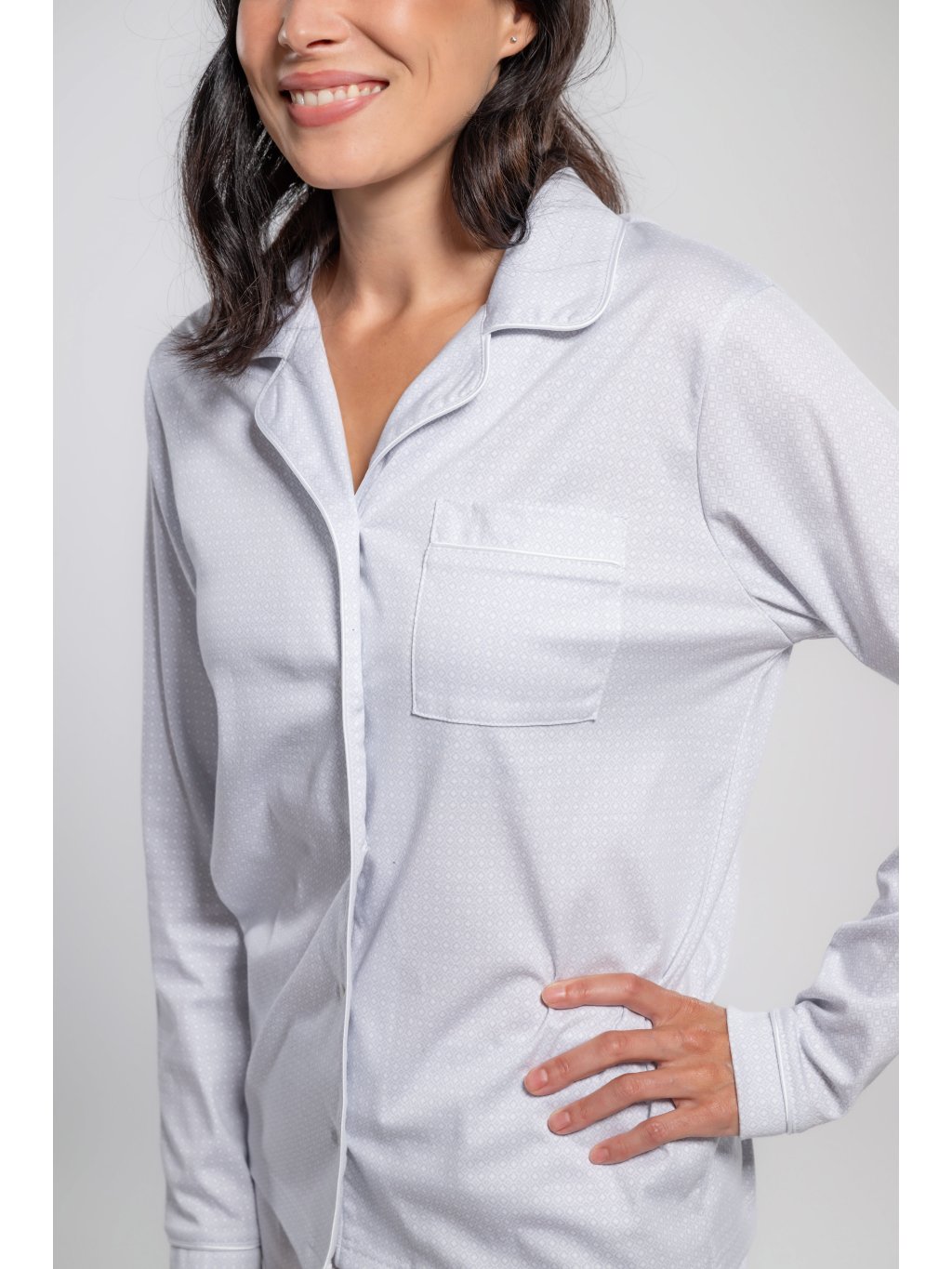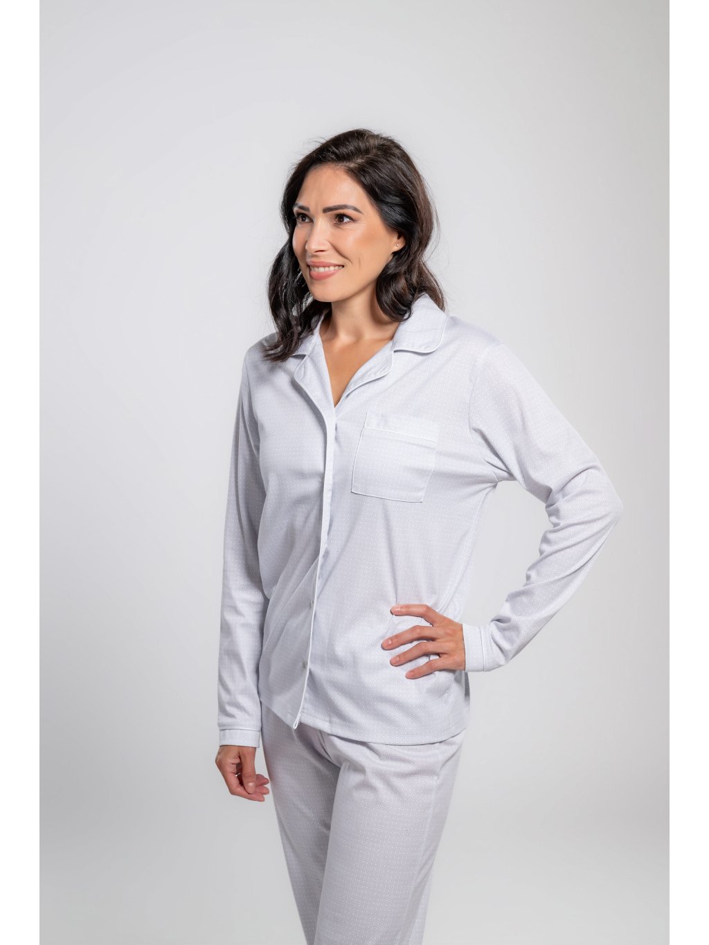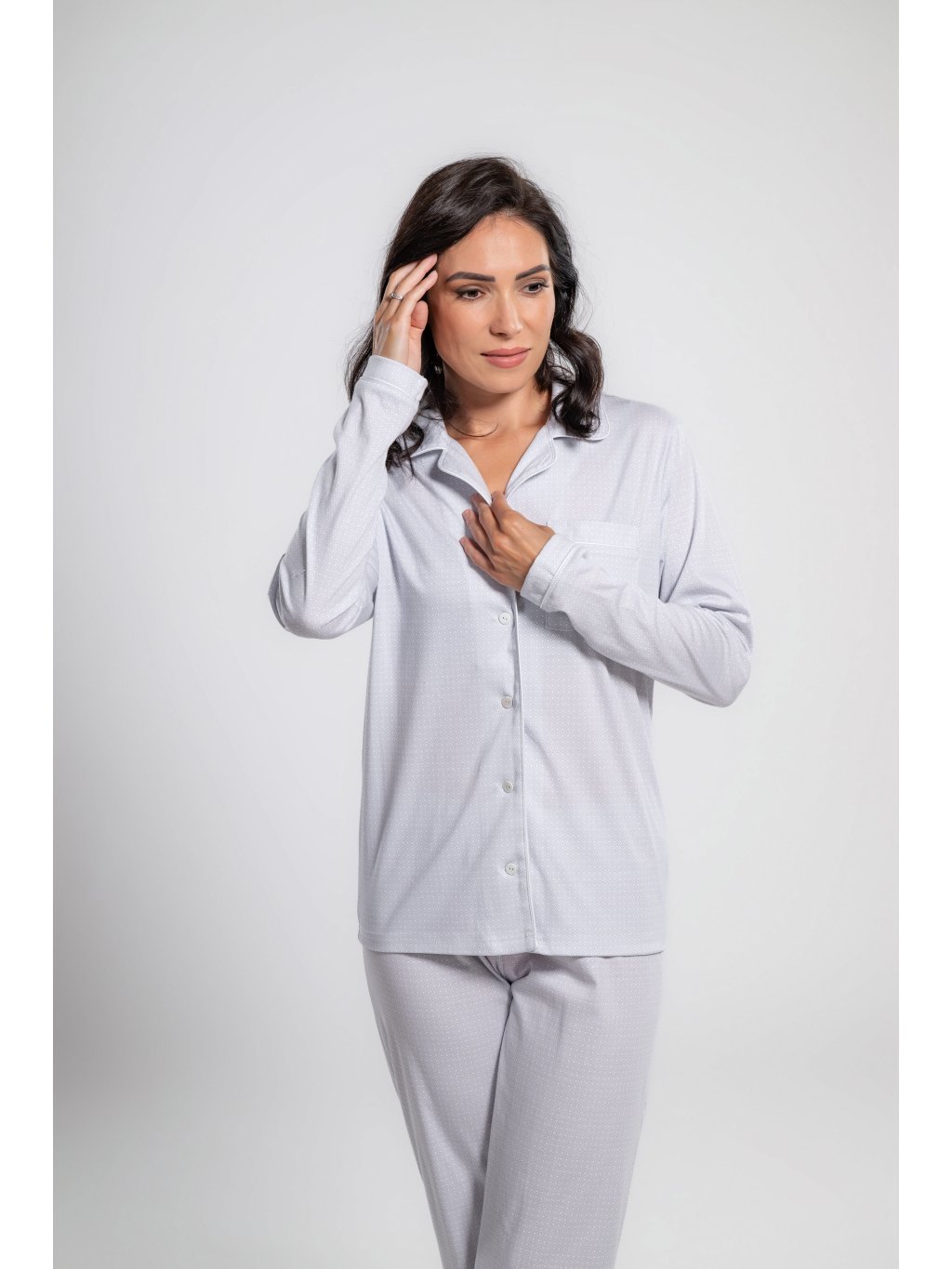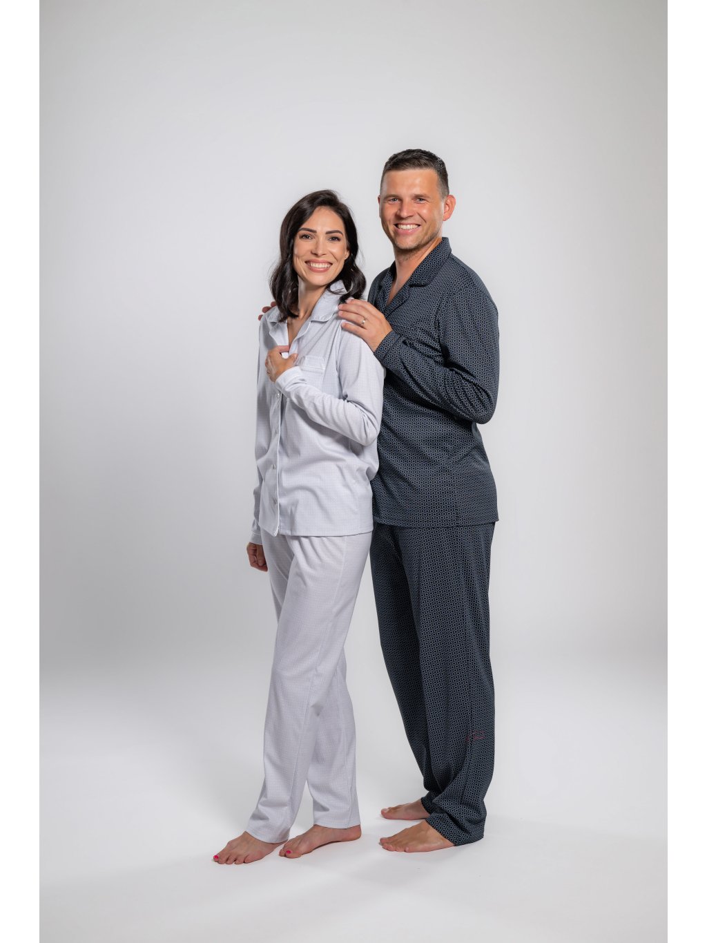 Atraktivní dámské propínací pyžamo Luxana – stylový design pro pohodlný spánek. Pyžamo Luxana se pyšní originálním zpracováním, které přináší atraktivní a elegantní vzhled. Vrchní část je doplněna o límeček a malou kapsičku na prsou, což přidává na stylovosti. Vyrobeno ze špičkového materiálu, pyžamo poskytuje maximální komfort a příjemný pocit při nošení. Součástí setu jsou dlouhé kalhoty, zakončené do lemu, a pružná guma v pase, která zajišťuje perfektní pohodlí během nošení.