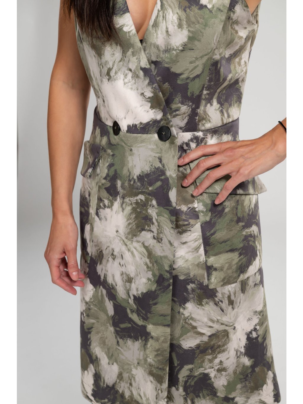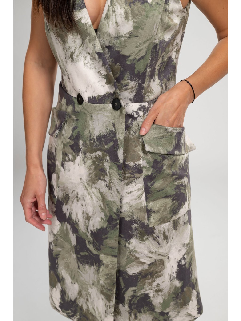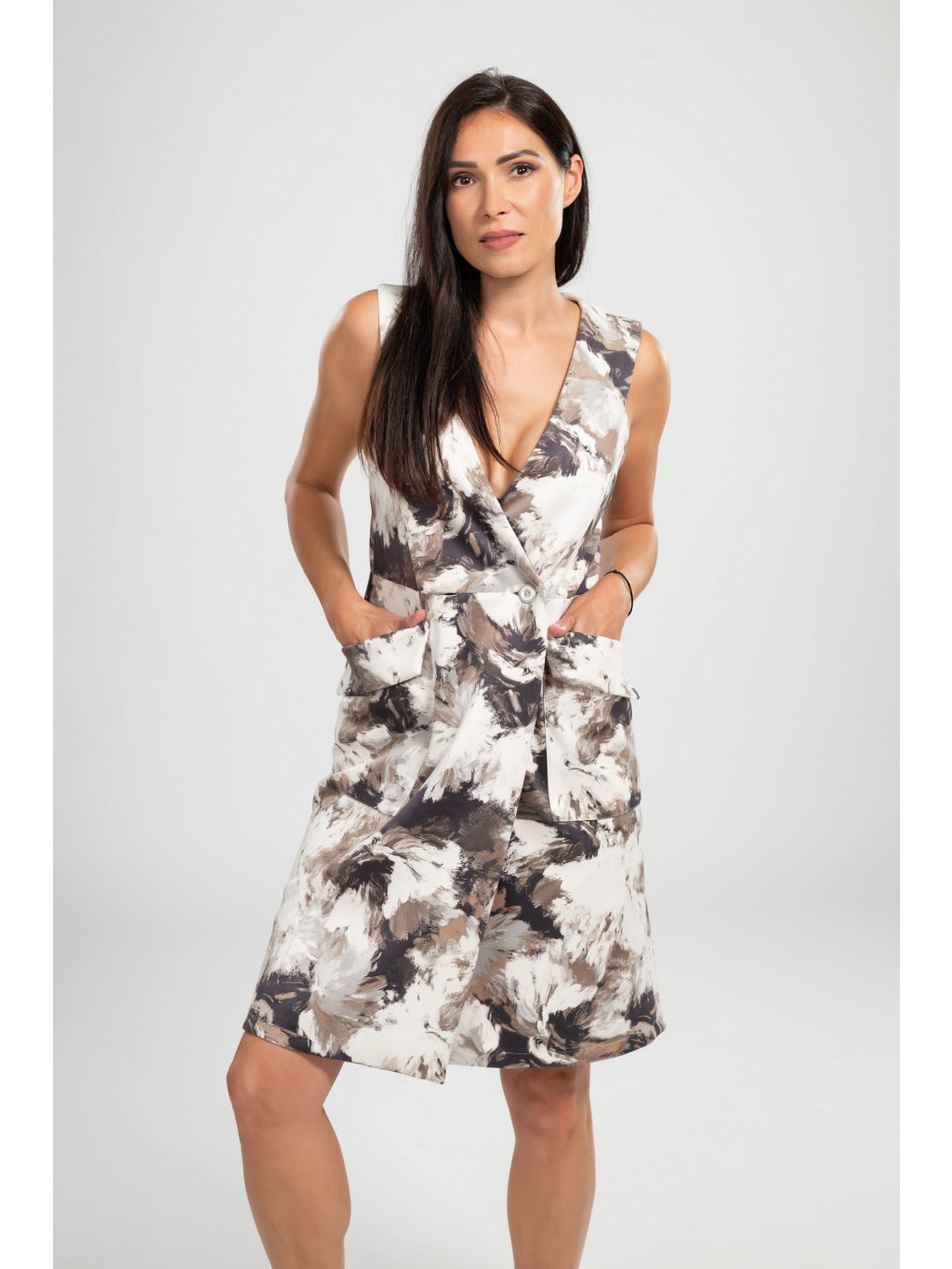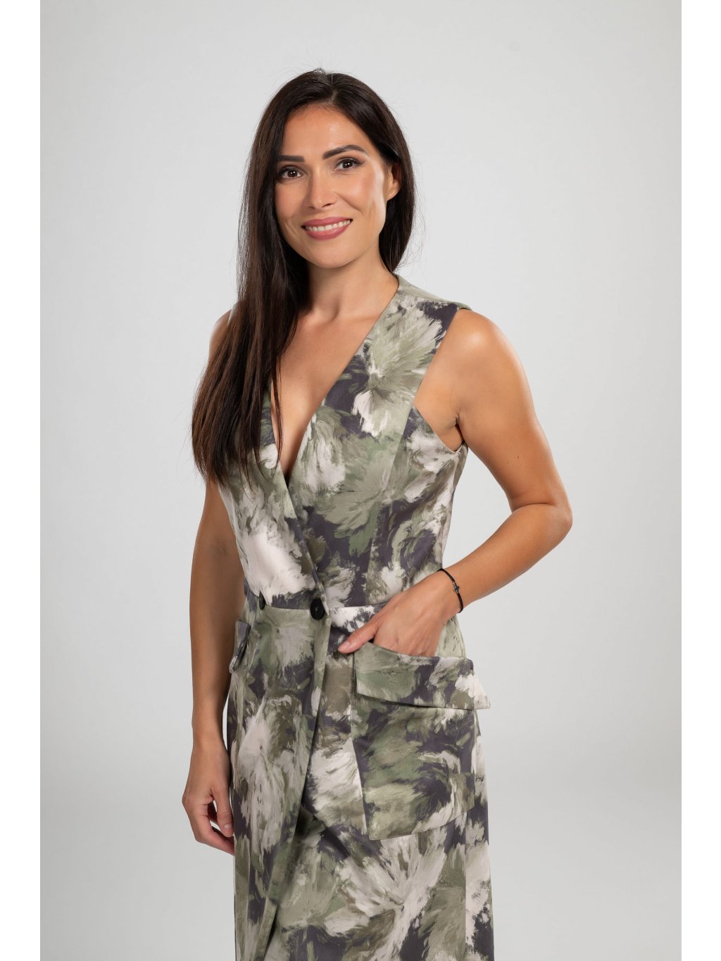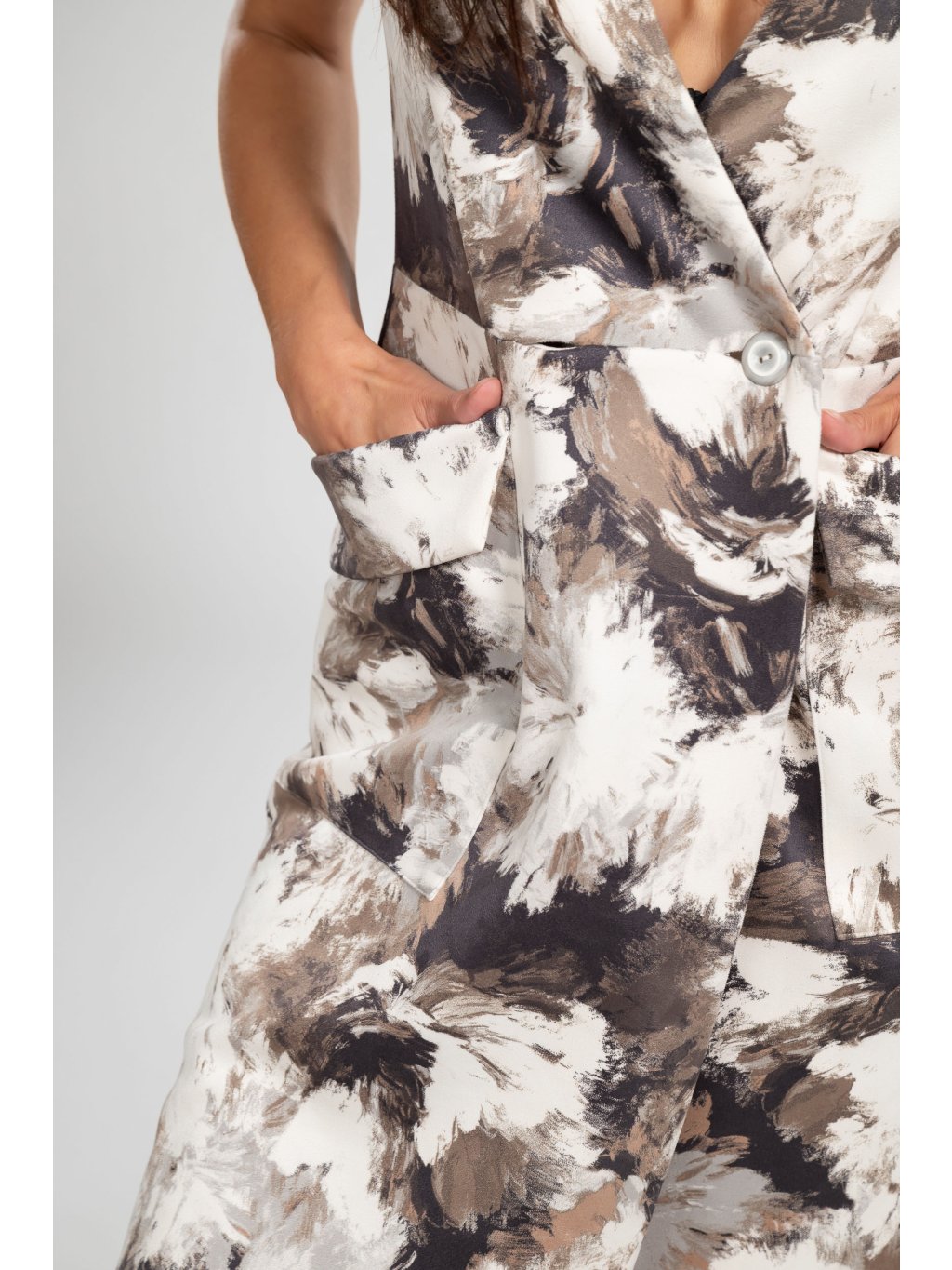 Bez rukávů, s elegantními knoflíky a praktickými kapsami, umožňují volný pohyb a pohodlí po celý den.