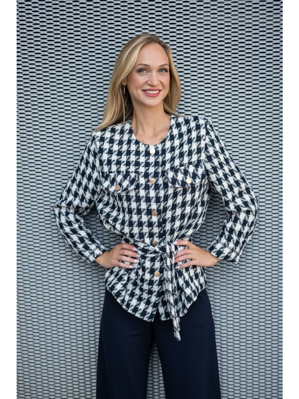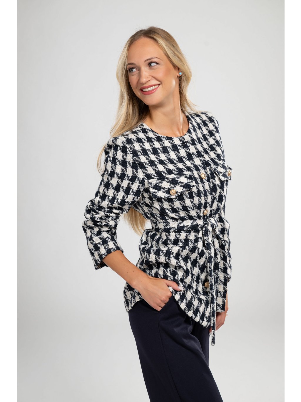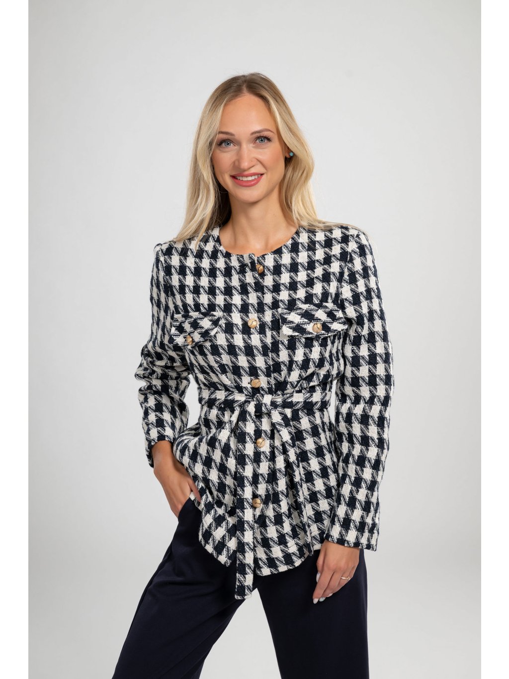 Elegantní kapsy na prsou, možnost stažení páskem v pase a zlaté velké knoflíky umocňují sofistikovaný look a dodávají kabátku jedinečný šarm.
